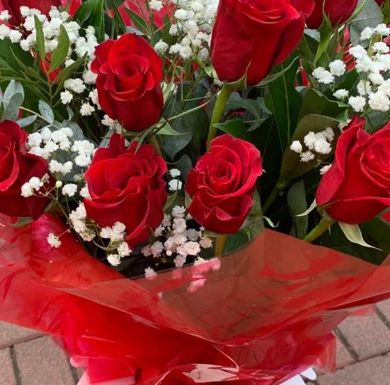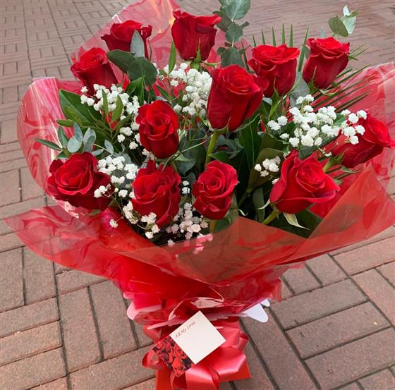 A DOZEN BEAUTIFUL RED ROSES WITH EUCALYPTUS AND GYPSOPHILIA, ALL WRAPPED AND PRESENTED IN AN AQUA BOX