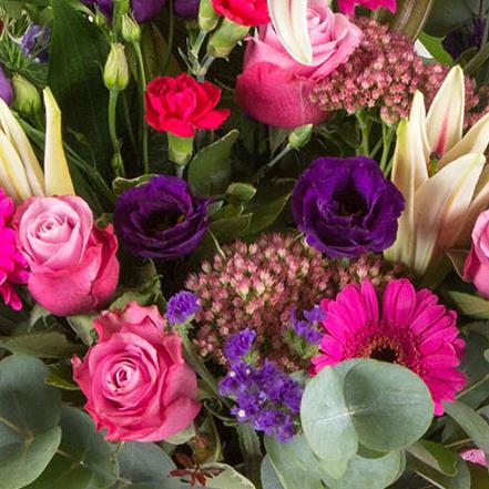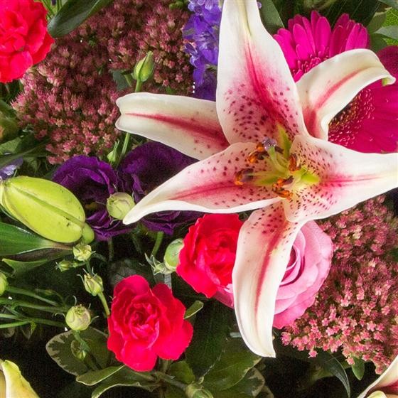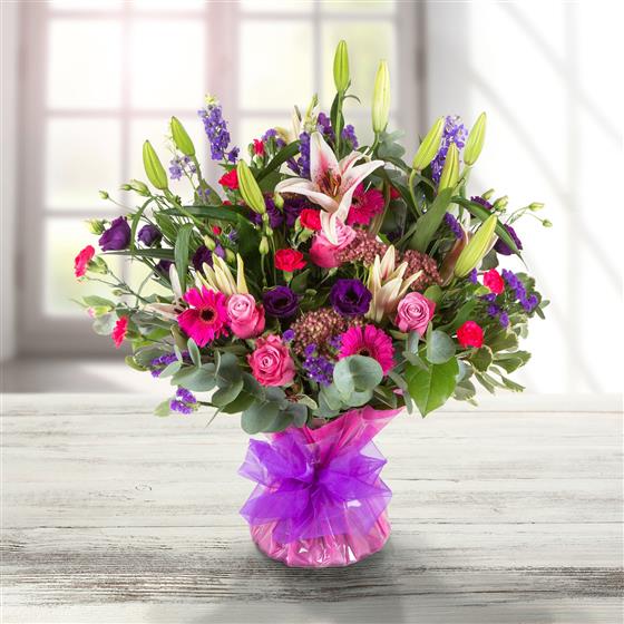 A bold, beautiful bouquet in shades of pink and purple including lilies, roses, and larkspur. A real show stopper!